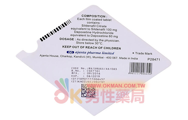 【活性成分】: 西地哪非100mg、達泊西丁60mg