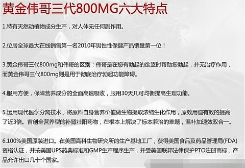 由美國高科生物研究所集多位醫學界精英研制,全天然草本的男性性保健產品。高效性,無副作用,每瓶黃金偉哥三代800MG都經過嚴格的核對和測驗。獨特的天然動植物配方可以增加血液的回流,釋放人體儲存的男性荷爾蒙,激活人體天然荷爾蒙制造,提供性動力及陰莖勃起必須的血液,增加陰莖血液容量,使勃起堅硬持久。